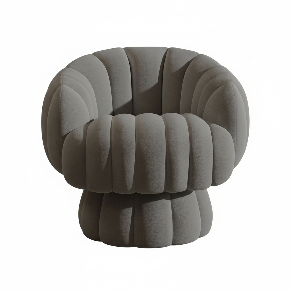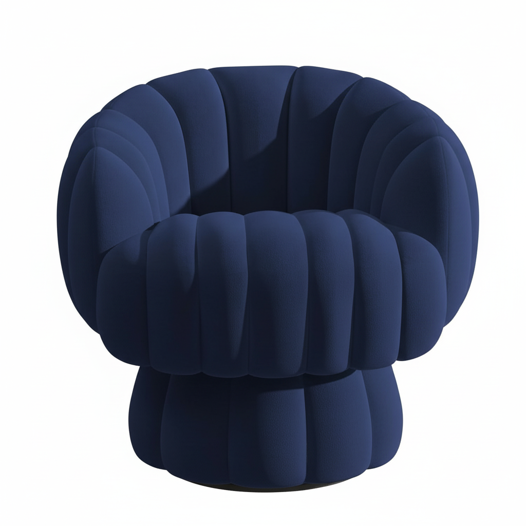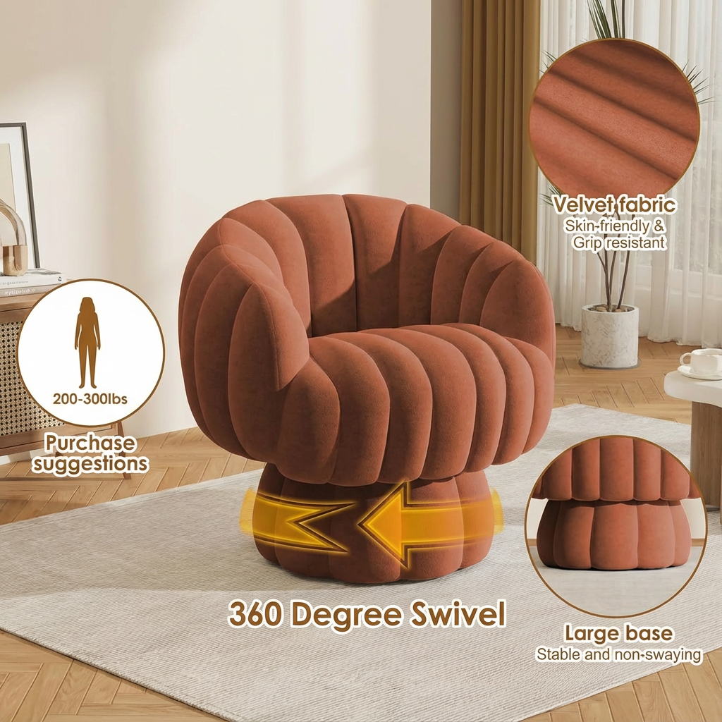 A modern accent chair designed for living rooms, bedrooms, offices, or dressing areas. Features a stylish pumpkin shape, swivel base, and plush velvet. Suitable for adults and recommended for reading or multipurpose use. The seat depth is 19.69″, back cushion supports ergonomic comfort, and the frame uses engineered wood and metal for stability.