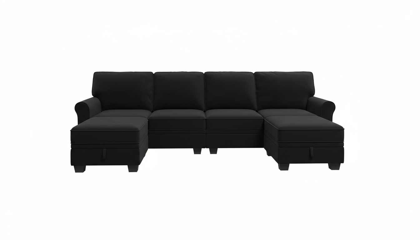 Built-in storage compartments make this HONBAY model perfect for those who value organization and decluttered living spaces. Six-person seating combines with hidden storage for blankets, pillows, and accessories. Luxurious velvet black upholstery adds elegance while the reversible chaise provides layout flexibility.